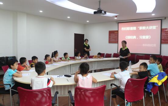 为进一步推进家庭教育,加强青少年的国学修养,丰富青少年的暑期生活,2016年7月5日,省农科院社区举办了主题为《诵经典 习童蒙》活动,由武汉大方学校心理学专家余明礼老师主讲,此活动为市妇联暑期“家教大讲堂”系列活动之一,吸引16名小朋友参加。