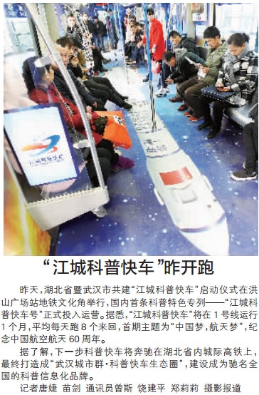 武汉晨报讯 (记者唐婕 苗剑 通讯员曾斯 饶建平 郑莉莉 摄影报道)昨天,湖北省暨武汉市共建“江城科普快车”启动仪式在洪山广场站地铁文化角举行,国内首条科普特色专列——“江城科普快车号”正式投入运营。据悉,“江城科普快车”将在1号线运行1个月,平均每天跑8个来回,首期主题为“中国梦,航天梦”,纪念中国航空航天60周年。