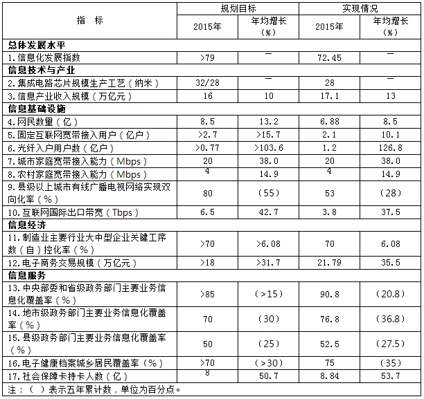 信息基础设施建设实现跨越式发展,宽带网络建设明显加速。截至2015年底,我国网民数达到6.88亿,互联网普及率达到50.3%,互联网用户、宽带接入用户规模位居全球第一。第三代移动通信网络(3G)覆盖全国所有乡镇,第四代移动通信网络(4G)商用全面铺开,第五代移动通信网络(5G)研发步入全球领先梯队,网络提速降费行动加快推进。三网融合在更大范围推广,宽带广播电视和有线无线卫星融合一体化建设稳步推进。北斗卫星导航系统覆盖亚太地区。