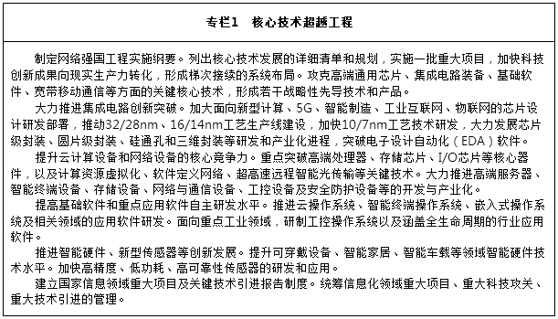 打造自主先进的技术体系。制定网络强国战略工程实施纲要,以系统思维构建新一代网络技术体系、云计算体系、安全技术体系以及高端制造装备技术体系,协同攻关高端芯片、核心器件、光通信器件、操作系统、数据库系统、关键网络设备、高端服务器、安全防护产品等关键软硬件设备,建设战略清晰、技术先进、产业领先、安全可靠的网络强国。统筹经济、政治、文化、社会、生态文明等领域网络安全和信息化发展,增强自主创新能力。