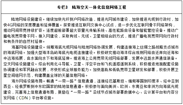 建设陆海空天一体化信息基础设施。建立国家网络空间基础设施统筹协调机制,推动信息基础设施建设、应用和管理。加快空间互联网部署,整合基于卫星的天基网络、基于海底光缆的海洋网络和传统的陆地网络,实施天基组网、地网跨代,推动空间与地面设施互联互通,构建覆盖全球、无缝连接的天地空间信息系统和服务能力。持续推进北斗系统建设和应用,加快构建和完善北斗导航定位基准站网。积极布局浮空平台、低轨卫星通信、空间互联网等前沿网络技术。加快海上和水下通信技术的研发和推广,增强海洋信息通信能力、综合感知能力、信息分析处理能力、综合管控运维能力、智慧服务能力,推动智慧海洋工程建设。