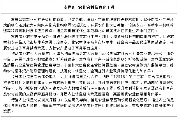 推进农业信息化。实施“互联网+现代农业”行动计划,着力构建现代农业产业体系、生产体系、经营体系。推动信息技术与农业生产管理、经营管理、市场流通、资源环境融合。推进种植、畜牧、兽医、渔业、种子、农机、农垦、农产品加工、动植物检验检疫、农村集体资产财物管理、农业资源环境保护、农村污水、农村能源,以及水利设施、水资源、节水灌溉、饮水保障等行业和领域的在线化、数据化。加快补齐农业信息化短板,全面加强农村信息化能力建设,建立空间化、智能化的新型农村统计信息综合服务系统。着力发展精准农业、智慧农业,提高农业生产智能化、经营网络化、管理数据化、服务在线化水平,促进农业转型升级和农民持续增收,为加快农业现代化发展提供强大的创新动力。