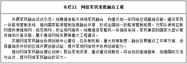 推进信息基础设施共建共用共享。统筹军地信息传输网络建设,构建军民共用的国家光缆网。深化天基通信系统融合发展,加快推动军民共用全球移动通信卫星系统建设。推进电磁频谱管理专项工程建设,构建军民协同合作的电磁频谱监测、检测和探测网系。加强军民共用信息系统建设,鼓励军队以购买、外包等方式从市场获取高质量、低成本的信息产品,充分挖掘利用民间优势数据资源和数据开发能力。实施军民融合信息资源开发利用工程,完善安全可靠的军地信息资源共享交换平台,规范军事信息资源向社会开放,探索利用企业互联网平台和社会科技资源为军队服务。加强国防科技工业综合管理信息化建设。