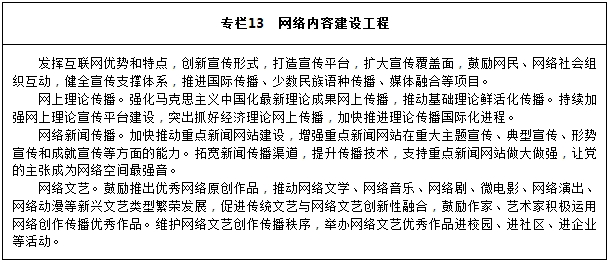 加快文化资源数字化进程。进一步推动文化信息资源库建设,深化文化信息资源的开发利用。继续实施全国文化信息资源共享工程、数字图书馆推广工程和公共电子阅览室建设计划。进一步实施公共文化资源网络开放,建设适合网络文化管理和社会公共服务的基础信息数据库群、数据综合管理与交换平台。实施网络文艺精品创作和传播工程,扶持优秀原创网络作品创作,支持优秀作品网络传播。扶持一批重点文艺网站。