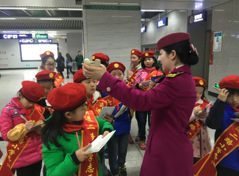 随后,车站站长一一回答了队员们提出的各种问题。经过站长为队员们讲解检票闸机和自动售票机的使用方法和注意事项后,队员们开始了站务员的体验生活。队员们很快进入工作状态,帮助乘客购买车票、帮助行动不便的老年人拎重物、引导乘客文明上下车等等,通过自己的辛勤付出进一步感受地铁站务工作。