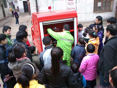 随后,同学们在社区义务消防队的带领下,来到社区刚配置的消防摩托前。社区胡主任用生动的语言现场向他们讲解了消防安全知识,并重点讲解了灭火器的使用方法、发生火灾时正确的扑救及逃生方法等两方面知识。