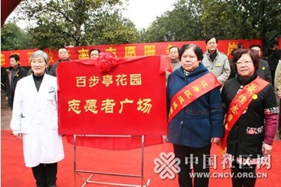 全国道德模范王争艳、全国优秀志愿者余洪芝和全国五星优秀志愿者孙朝娟为百步亭社区“志愿者广场”揭牌