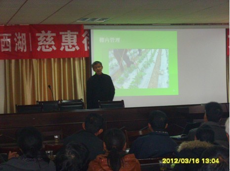 在培训班上,董老师通过多媒体课件对农户细致而生动的讲解当前蔬菜苗期大棚管理技术,如何科学有效的使用药物进行有效防治,同时还对化学除草剂在使用中对田间土壤的危害性作了具体的事例分析。董老师的讲解深入浅出、通俗易懂,深受广大农户的欢迎。