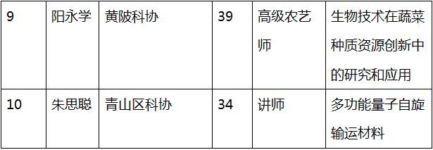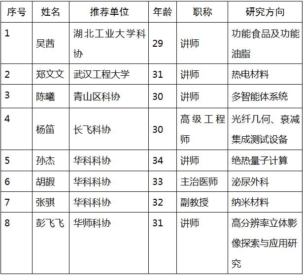 根据《关于开展2017年武汉市青年科技朝阳计划工作的申报通知》,按照《武汉市青年科技朝阳计划管理办法》,经过推荐申报、资格审查、专家评审,共有10名青年科技工作者符合条件,现将名单予以公示: