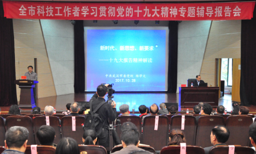 市科协网讯 11月10日上午,举办全市科技工作者学习贯彻党的十九大精神专题辅导报告会。市科协党组全体成员、退休党员干部代表,各市属学会(协会、研究会)、高校科协、企事业科协秘书长,各战线的科技工作者代表,各区科协全体党员干部,市科协机关和直属单位全体党员干部职工近300人参加了学习活动。报告会特邀了中共武汉市委党校常务副校长、武汉行政学院常务副院长杨学文同志做专题辅导报告,通过集中学习动员,掀起了我市科技界学习宣传贯彻党的十九大精神的热潮。