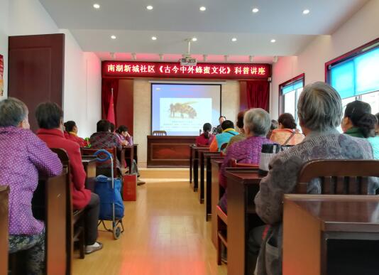 2017年10月20日,洪山街南湖新城社区开展“古今中外蜂蜜文化”科普讲座,讲座在社区三楼的家长学校举行,特聘华中农业大学张新军教授现场教学,讲师在讲授古今中外蜂蜜文化过程中与居民群众互动,解答居民群众提出的各种疑问,将讲座推上了高潮。