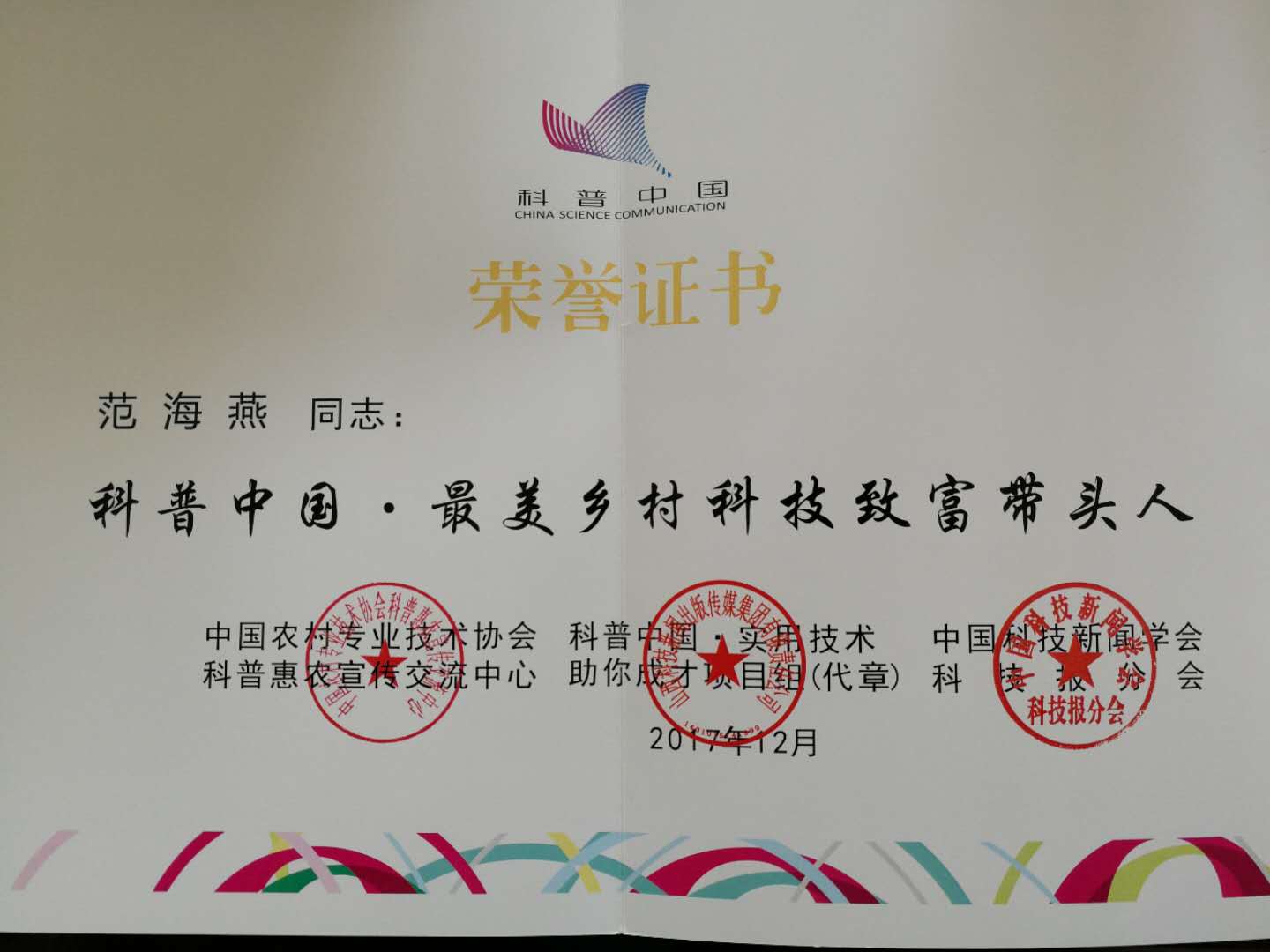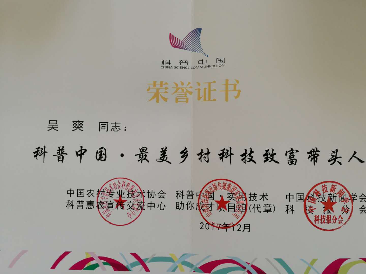 论坛同期举行了“科普中国•最美乡村科技致富带头人”活动颁奖仪式。活动由中国科协主办,科普中国·实用技术助你成才项目组联合全国科普惠农绿色通道办公室、全国科技报刊创新发展联盟承办,旨在广大农村营造学科学、用科技的良好氛围。武汉市黄陂区循环家庭农场理事长朱兰萍等12人被评为“全国标兵”称号、武汉友吉名优农产品专业合作社理事长范海燕和绿色方舟农产品专业合作社董事长吴爽被授予“科普中国•最美乡村科技致富带头人”称号。本报荣获“优秀组织奖”。