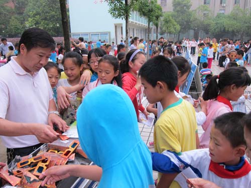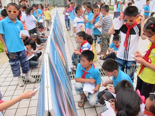 这次活动由武汉科技馆和蔡甸区科协联合组织,武汉科技馆带来了阿尔伯特.爱因斯坦展览和声光电展览,区科协带来了“世界末日解读”3D立体科普展板。科普车一进校园,工作人员就立即布展。学生们在老师的引导下,非常有序地参观展览,并动手进行操作各种科普仪器,尽管下着蒙蒙小雨,小学生们玩得十分开心。在3D立体展板前,孩子们戴着眼镜,认真进行观看,了解节能减排知识;在爱因斯坦展板前,小学生们被世界科学巨匠的事迹深深吸引住了,他们边看边拿出小本子记,生怕漏忘了。从他们童真的笑脸上看出了欢乐和幸福。