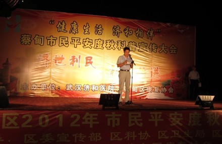 市科协网讯 为了进一步贯彻落实 2012年蔡甸区“全国科普日”活动,积极向全区广大市民宣传普及科学知识,9月7日,由蔡甸区委宣传部、区科协、区卫生局、区药监局、区文体局指导,由区重疾症人科学康复会、武汉济和医院联合在济和广场举办了2012年度平安度秋科普宣传晚会。