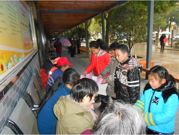 为使社区居民过一个低碳、环保、文明、祥和的春节,硚口区宗关街发展社区的十二名小志愿者,在说和谐志愿服务队的带领下,开展“拒绝雾霾,少放鞭炮”的宣传活动,将宣传单送到居民手中,并劝说居民,在这个春节与鞭炮说“NO!”。