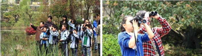 “你看见了那只鸟了吗,它为什么叫白头鹎,因为头是白的,民间称白头翁。”2013年3月29日,华中师范大学鸟类专家戴宗兴、周权(洪山区展教联盟成员)为名都花园社区的观鸟爱好者普及观鸟知识。