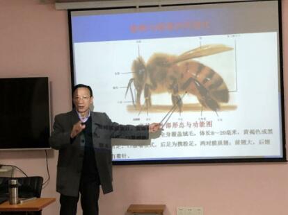 讲座中,张教授首先利用视频、图片为大家讲解了蜜蜂的起源,一是蜜蜂的采制物,如蜂蜜、蜂花粉、蜂胶等;二是蜜蜂的分泌物,如蜂皇浆、蜂蜡、蜂毒等;三是蜜蜂自身的躯体,如蜜蜂虫、蜜蜂蛹等;然后讲解了这些蜂产品各自的用途是什么,真假蜂蜜的辨识。
