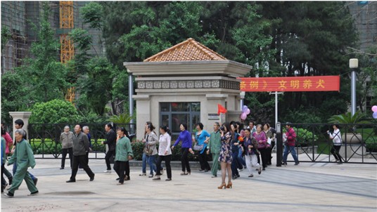 10时15分随着响起的警报声各位疏散组长到达指定地点引导各小组成员快速疏散,特别是旺斯达幼儿园教师带领小朋友弯着腰,用手帕、毛巾等捂住口鼻沿指定通道井然有序的撤离到小区广场安全地带。各疏散组长清点人数后向指挥部报告。整个疏散过程只用了短短的几分钟,全部参演居民和救护小组成员安全疏散完毕。随后,瑞湖天地的佳睦物业的保安们有条不紊地进行了灭火器、消防水带和消防车进行灭火的演示,并与居民一起互动,对初期“火情”现场进行及时扑救。11时,整个消防演练在紧张有序,安全得到保障的情况下圆满结束。