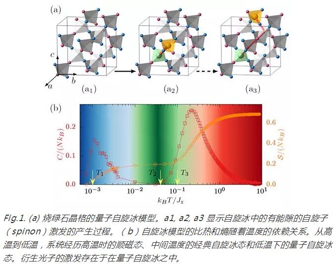 研究人员结合数值模拟和理论分析,研究了量子自旋冰中拓扑元激发的动力学行为。量子自旋冰(如图1所示)是一类典型的三维量子自旋液体,其中的拓扑元激发包含衍生光子和自旋子。衍生光子的物理性质类似于量子电动力学中的光子,而自旋子则类似于电荷。他们运用大规模量子蒙特卡洛和随机解析延拓的方法,首次直接定量刻画了一个模型自旋冰体系中这两类元激发的动力学特征(如图2所示)。在自旋激发谱函数这一实验可观测量中,衍生光子表现为无能隙的共振模式,而自旋子表现为有能隙且弥散的连续谱。这二者均直接证实了此前唯象场论的定性预言,而且可以直接和中子散射和核磁共振等实验结果进行直接对比。该研究的数值计算和理论分析的结果,对目前正在快速发展之中的阻挫磁体和量子自旋液体、量子自旋冰等领域的相关实验工作具有指导意义。