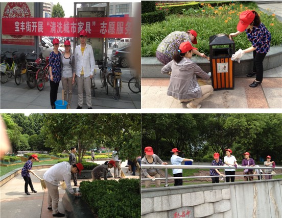 5月17日上午,空后社区科普志愿者来到硚口人民广场,参加宝丰街组织的“清洗城市家具”志愿服务。各社区各文明单位志愿者为了让市民拥有舒适、干净的环境,不惧炎热,顶着烈日对广场进行彻底清洗。志愿者们提着水桶、拿着抹布、扫帚清洗广场上的“城市家具”:大家蹲在地上一遍一遍地擦垃圾桶,蒙着厚厚灰尘的电线杆和护栏被擦洗的锃亮锃亮,广场地面也被志愿者们清扫的干干净净。此次活动得到周围市民广泛赞誉,纷纷感谢志愿者的辛勤劳动,对志愿者为城市作出的贡献表示敬意。