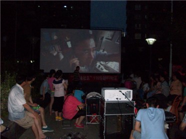 晚上六点,放学的孩子和劳碌一天的大人陆续来到广场观影,现场气氛相当活跃,邻里亲朋有的聊着天、有的一边喝着茶等着电影的开始,每到夏天,放映电影已经成为社区居民们在夏季夜晚的一种休闲文化方式,居民说“现在电影院的票太贵,一人在家看电视又太闷,能和这么多邻居在一起看电影很温馨。”社区外来务工者也说,在异乡的夏夜,看露天电影是一种愉快的享受。