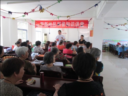 针对近来天气持续高温难耐,为了帮助老年人顺利度夏,提升他们的健康意识和自我保健能力, 2013年6月17日,韩家墩街四新社区科协邀请街卫生服务中心的医生徐飞社区独居、空巢老人讲述了高温天气下的医疗保健科普知识