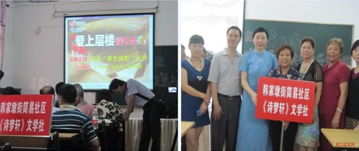 6月29日,韩家墩街简易社区“诗梦轩”文学社一行10人应《长江日报》新浪微博的邀请,由区机关工委吴双墩书记组织,在水厂路小学功能厅参加了“爱上层楼读书会”以文会友的联谊活动。