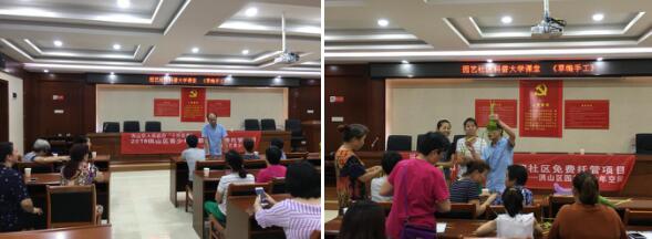园艺社区科普大学课堂第九节课是《草编手工》,来给我们讲课的是华中农业大学的张厚平老师,老师首先给我们讲述了草编这门历史悠久的手工艺术的来历和悠久的历史文化。然后给我们欣赏了一些草编成的工艺作品,凤凰、飞鸟、虾等作品编织的栩栩如生,灵活生动。老师开始教大家从最简单的青蛙开始学草编,首先给大家发了材料,然后开始讲课,老师先让大家看和听老师是怎么讲怎么编的,用什么方法原理,先不要自己动手,老师讲过一遍之后,大家看明白了之后,就都跟着老师一起再来编一次,时不时的有居民提问,老师都会走过去耐心的教一遍,课堂气氛非常好,到课程结束时,大家的小青蛙都编的差不多了,还有些小问题小细节也都在老师的帮助下解决了。最后大家看到了自己编得的成果都非常开心。