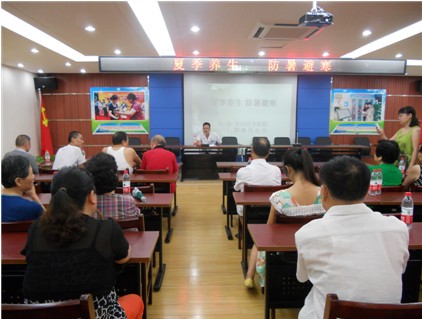 在讲座中,许利民医生讲解了夏季养生应该注意哪些事项,并结合辖区居民的情况,分别回答了居民提出的各种养生方面的问题。除此之外,徐医生还专门从饮食和生活起居方面,谈了在夏季如何避暑防暑,健康生活的问题。要求大家多吃绿色、环保的方法降温。如多吃瓜果、生姜、蔬菜,徐医生还特别叮嘱老年群众不要多喝金银花茶,要适当的选择喝菊花茶,并讲解了如何泡茶更为科学。
