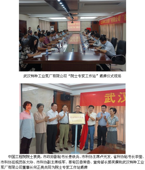 8月16日上午,武汉特种工业泵厂有限公司(简称武汉特泵) “院士专家工作站”揭牌仪式在该公司会议大厅隆重举行。仪式由巡视员张太玲主持,副主席杨军宣读了院士专家工作站的批复文件,省科协秘书长李莹为袁亮院士颁发了特聘院士聘书。市政府副秘书长姜铁兵代表市领导讲话,并与市科协主席卢光发等领导共同为院士专家工作站揭牌。