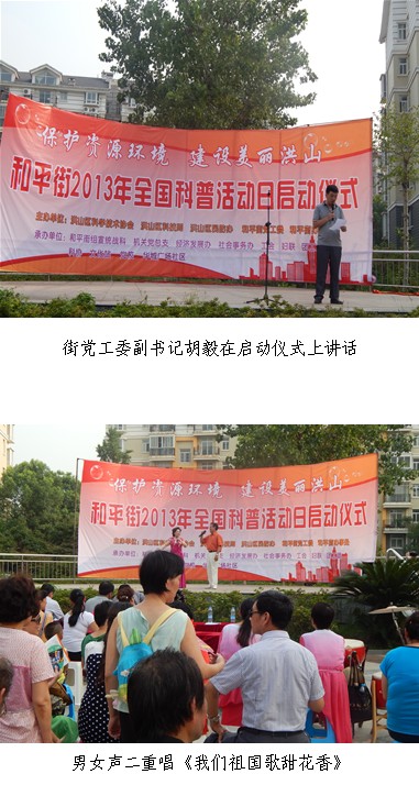 9月14日下午,2013年和平街全国科普日活动启动仪式在华城广场社区中心广场举行。洪山区科技局书记李德广、副局长陈诗良,洪山区科协主席董祖恩、副主席丁元珍、办公室主任魏朝晖,和平街和平街党工委副书记胡毅、机关党总支书记、人武部部长曾会斌等区、街领导出席了启动仪式。民防办负责人、社会事务办主任李翠琴、科协张治国、文化站站长闵红霞,华城广场社区群干、居民近400余人参加了启动仪式。
