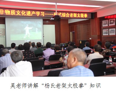 吴老师深入浅出的指出:太极拳作为中华非物质文化遗产,练习太极拳对人的身心养身都会产生很大的好处。并对“杨式综合老架太极拳”进行了简单的讲解,如它以阴阳五行学为根本,以胜战的招数为基础,以后发制人、柔能克刚为着眼点,以防身健体、祛病延年为目的等。接着,吴老师将“杨氏综合老架太极拳”简单招数进行了演示,现场学员们纷纷一招一式的学习。授课完后,吴老师和大伙进行了互动,对大家的各种练习动作、姿势进行指导纠正。大家通过老师的演示,结合自己平时太极拳的练习,纷纷提出自己的问题,吴老师一一耐心的解答,最后,在大家热烈掌声中结束了今天的讲座。