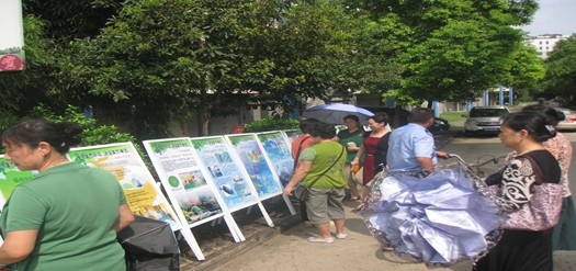 2013年9月13日下午学雅芳邻社区举办以“建设生态环境 圆梦美丽中国”为主题的科普日宣传活动,社区工作人员在小区广场给居民发放“爱护环境,低碳环保”倡议书,在社区大门口摆放展板。