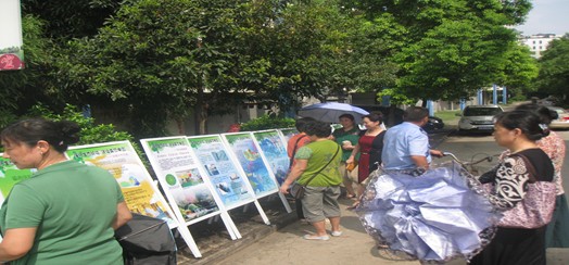 2013年9月13日下午学雅芳邻社区举办以“建设生态环境 圆梦美丽中国”为主题的科普日宣传活动,社区工作人员在小区广场给居民发放“爱护环境,低碳环保”倡议书,在社区大门口摆放展板。