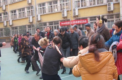 2014年1月5日早上9点,随着居民毽球队的精彩表演,将江汉区北湖街在天门墩中学操场上举办的新春趣味运动会拉开了序幕。此次活动共有五个项目:金玉满盆、穿衣迎新、端乒乓球竞走、沙包掷准、团体拔河。在比赛中,参赛者们你追我赶,个个精神抖擞、充分展现了居民健康向上的精神风貌。