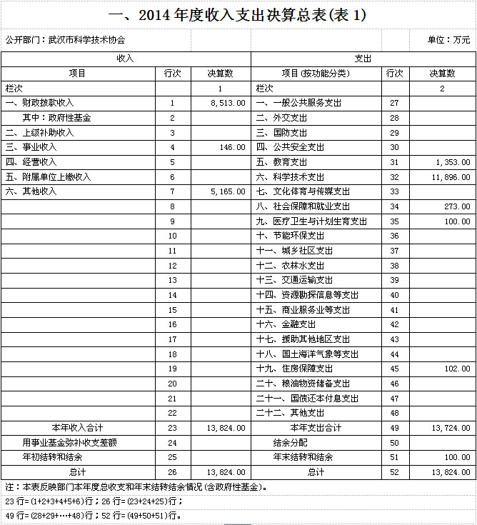 2014年度收入总计13,824万元,支出总计13,724万元。与2013年相比,收入减少16.3%,支出减少16.9%。引起收支减少的因素是由于优秀科技工作者评选、优秀自然科学学术论文评选等项目为两年执行一次,2014年度未执行该项目;2014年项目结构调整,相应的项目资金做了调整;科技馆新馆内容建设中各展厅展品及布展配套设备设施陆续招标后投入建设中,工程项目周期长,需按照合同要求和工程进度支付。