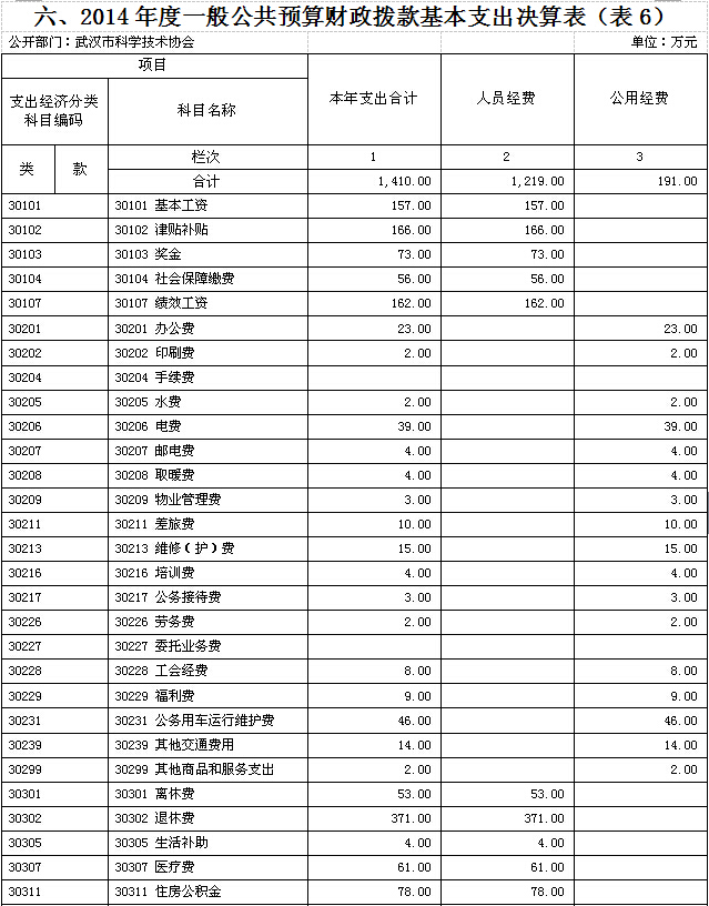 2014度一般公共预算财政拨款基本支出1,410万元,其中,人员经费1,219万元,主要包括:基本工资、津贴补贴、奖金、社会保障缴费、伙食补助费、绩效工资、其他工资福利支出、离休费、退休费、抚恤金、生活补助、医疗费、住房公积金、提租补贴、购房补贴、其他对个人和家庭的补助支出;公用经费191万元,主要包括:办公费、印刷费、咨询费、手续费、水费、电费、邮电费、取暖费、物业管理费、差旅费、因公出国(境)费、租赁费、会议费、培训费、公务接待费、劳务费、委托业务费、工会经费、福利费、公务用车运行维护费、其他交通费用、办公设备购置、其他资本性支出。