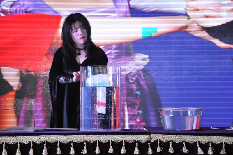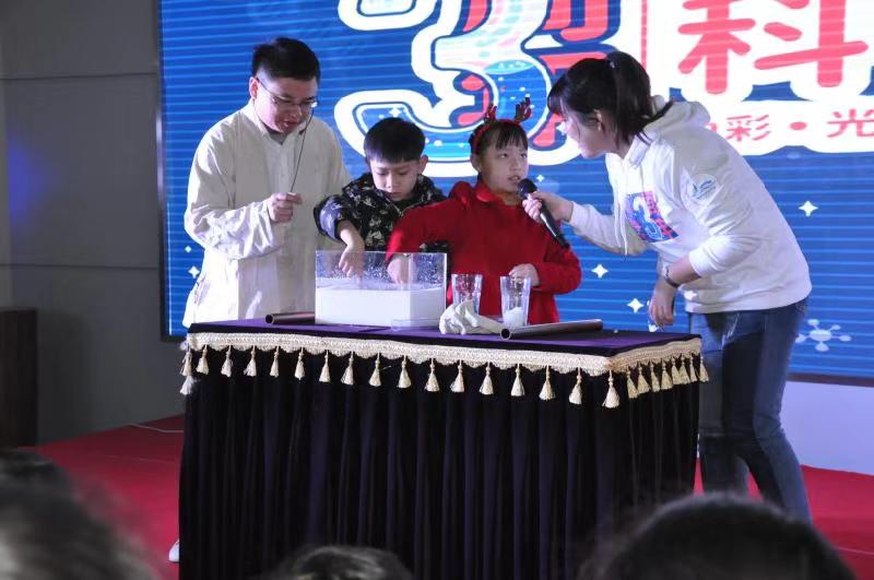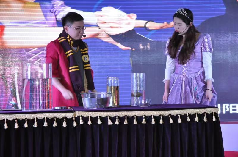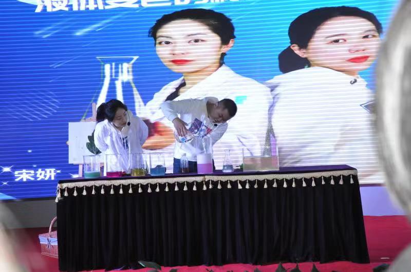 在活动互动环节,现场观众在回答主持人的提问或完成主持人设置的挑战后,收到了主持人奖励的礼品券,可以领取“空气炮”、“旋转的风铃”、“小球发射枪”、“纸飞机发射器”、“会变色的魔瓶”等精美奖品。其中,蔬菜由绿色变色,把红色、绿色的溶液倒入蓝色溶液中,溶液变成红色等表演深受观众喜爱。