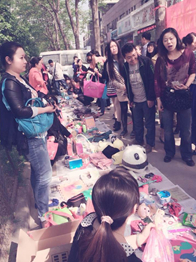 4月9日上午,江汉区“社区淘淘乐”跳蚤市场活动暨唐家墩街、北湖街淘淘乐低碳环保换购活动在菱角湖万达的日月小区门前隆重举行。两条街道16个社区的科普志愿者们带着居民的闲置物来到活动现场,衣物、鞋帽、小电器、玩具、书籍等众多物品吸引了菱角湖周边的居民和路人前来观看、交流换购。