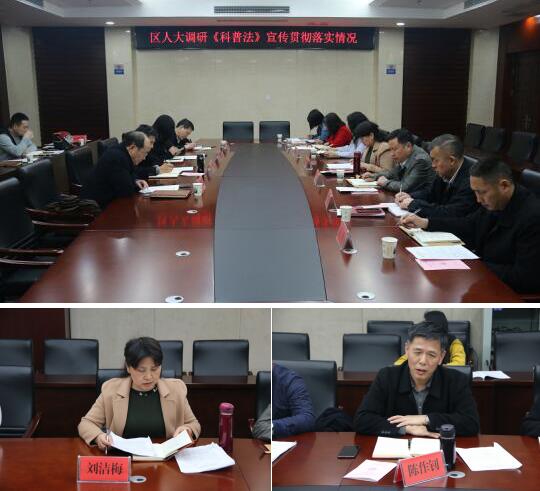 区人大领导听取了区科协贯彻落实《科普法》情况汇报。区科协党组书记、主席刘洁梅就“我区科普体系概况、主要工作、主要做法、存在的问题、科普工作建议、2019年区科协工作思路”六个方面进行了汇报。