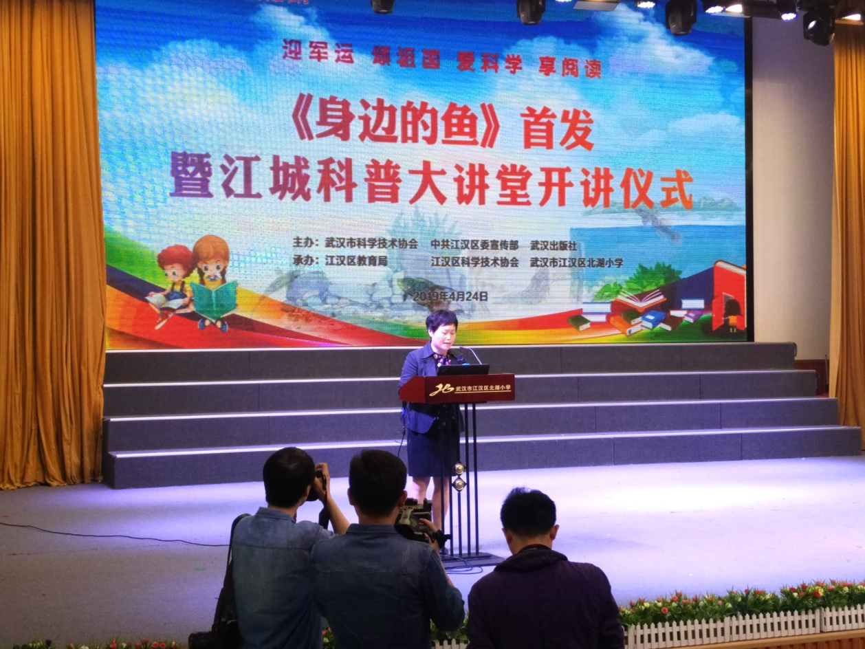 4月24日下午,在江汉区北湖小学报告厅,由市科协、江汉区委宣传部和武汉出版社共同主办的“江城科普读库”之《身边的鱼》首发暨江城科普大讲堂开讲仪式隆重举行。市科协党组成员、副主席郑华出席活动并讲话。