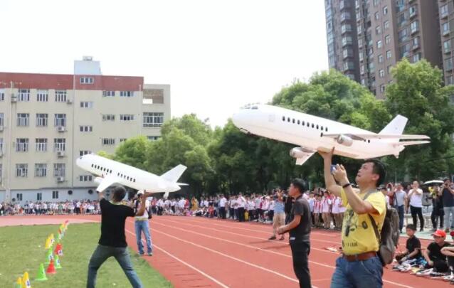 看,爬升、俯冲、盘旋……飞机在空中不停地快速变换着动作,表演者双手握着摇控器,从容的控制着方向。各种航空模型在操场上一一呈现,引得现场的师生们爆发出热烈的掌声和惊呼声。航模社团的压轴表演是由陆家街中学柯梓鸣完成的和C919一样的两架双发大飞机,这两架飞机模型内部充气,能模拟客机低速飞行。让同学们感受到了航模的魅力。