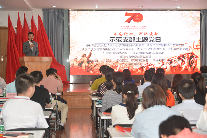 6月18日下午,“不忘初心,牢记使命”联合支部主题党日暨“科学家江汉社区行”第五场活动在中国通建三局党员活动室举行。区科协机关党支部联合中科院武汉文献情报中心党委、常青街扬子社区网格党支部、新华街邮三社区网格党支部、武汉教育电视台各党支部、中国通信建设第三工程局有限公司机关党支部,及爱尔眼科汉口医院、亚心医院、存济口腔医院、新金科技、新东网科技等5家企业科协党员代表等共120余人参加活动。