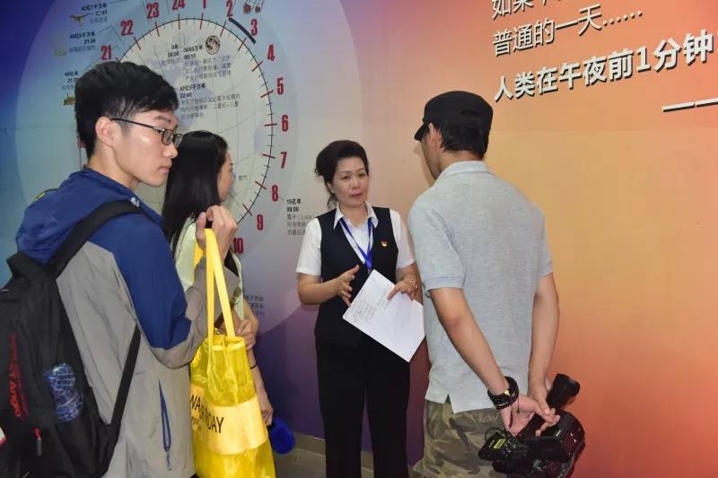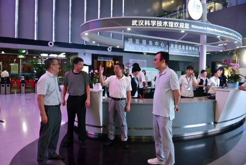 △武汉科技馆馆长、党委书记刘青(右二)向新闻媒体介绍武汉科技馆夜间开放情况