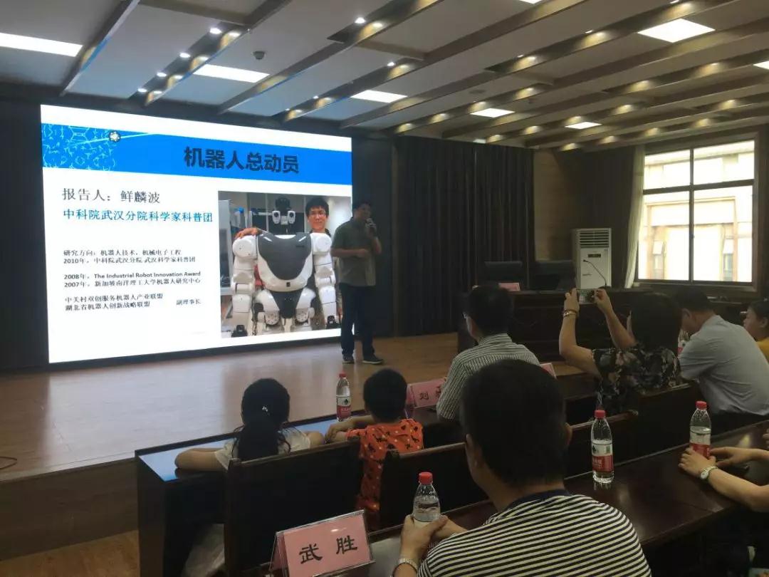 8月15日,江汉区科协举办的“科学家江汉社区行”第七场活动在民族街政务中心四楼活动室召开,特邀湖北省机器人创新战略联盟秘书长、武汉科学家科普团团员鲜麟波为大家详细介绍了机器人的发展演变及其广泛的运用前景,极具前瞻性。江汉区科协党组书记、主席杨艳、民族街工委副书记谌宗鹏、社区居民和青少年共100余人参加了此次活动。