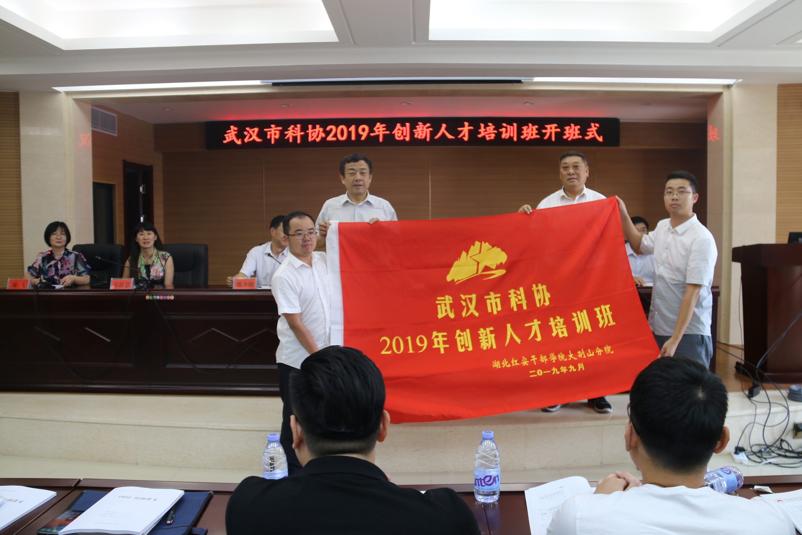 最后,党组书记、副主席陈光勇,湖北红安干部学院大别山分院副院长张盛潮一起为学员代表授旗。