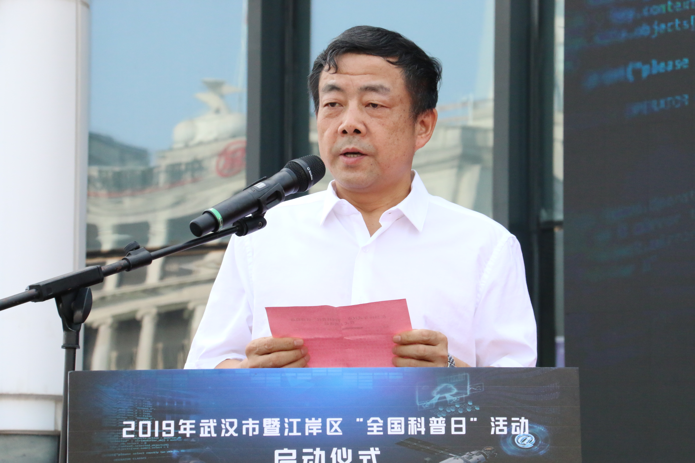 江岸区人民政府区长张忠军代表区委、区政府致辞,党组书记、副主席陈光勇介绍了2019年武汉市“全国科普日”活动情况,并为2019年武汉市科普特色社区、科普特色单位(基地)、科普特色学校代表授牌。