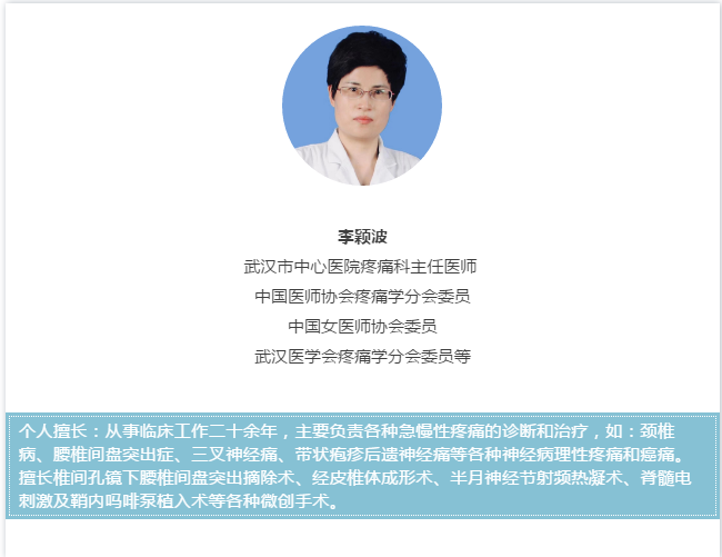 李颖波 武汉医学会疼痛学分会委员、武汉市中心医院疼痛科 主任 医师