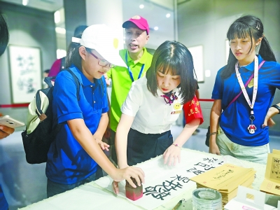 黄鹤楼美术馆为游客提供毛笔书写体验服务