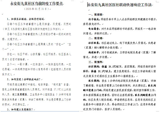 二是科学指导提效能。面对社区居民多、发热病人排查任务重现状,帮助社区制定《永安街九真社区当前防疫工作要点》(两期)和《永安街九真社区医社联动快速响应工作法》,科学指导社区改进工作,提高工作效能。